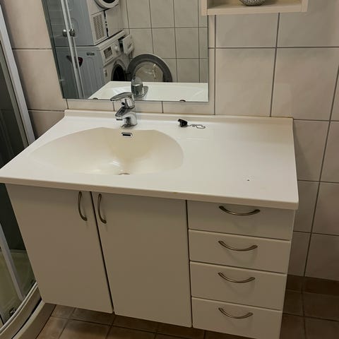 Passer til montering på bad der det er behov for kombinert servantløsning, speil og god oppbevaringsplass. Materialet fremstår som malt eller laminert overflate i hvit farge, egnet for bruk i våtrom med normal ventilasjon.