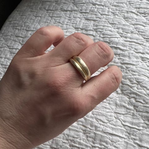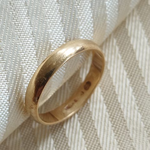 Pen gullring selgast. Ca. 4,5g 18 K gult gull. Nøytralt design med to "snitt", eit på kvar side. Diameter ca. 19,5mm (størrelse 61 slik eg forstår). Utan merker inni, men kjøpt av meg med frå forhandlar i Brüssel i 2018, og 18K framgår av kvittering. Aldri brukt av meg pga. kjøp av annan ring.