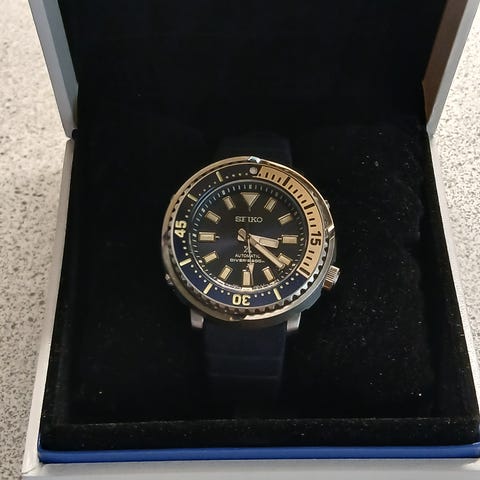 Svært pent brukt Seiko Prospex Automatic Monster Diver's Watch SRPD2K1, med NATO tekstilrem. Seiko silikonrem er tilgjengelig. Produsert mars 2019, kjøpt januar 2020, eier døde januar 2023. Har ikke vært brukt eller til urmaker siden.