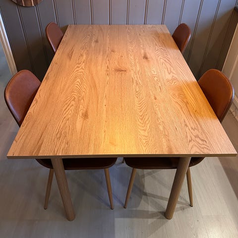 Koselig spisegruppe i lys bøk fra Bohus. M/ileggsplate og 6 stoler - noen synlige bruksmerker men ellers i god stand. 3 m med ileggsplate