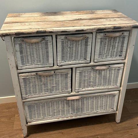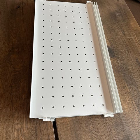 Veggmontert oppbevaringsboks i veldig god stand. Rent og minimalistisk hvitt design som passer godt inn i et arbeidsområde, studio eller hjemmekontor. Inkluderer flere praktiske tilbehør som beholdere, kroker og en kurv for oppbevaring. Flott for å organisere kontorrekvisita, små verktøy, sminke eller hverdagsartikler. Inkluderer også en fleksibel veggmontert lampe som kan justeres for å rette lyset dit du trenger det. Enkel å montere på veggen og praktisk for å holde ting organisert.