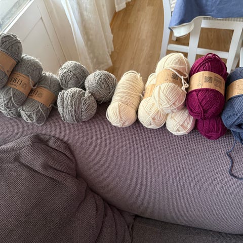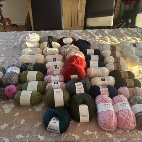 Blandet garnpakke med ulike typer garnnøster i flere farger. Pakken inneholder både ensfarget og flerfarget garn i ulike tykkelser, fra tynnere garn til mer chunky varianter. De fleste nøstene er i naturfibre som 100 % ull, blant annet cashmere, merino.