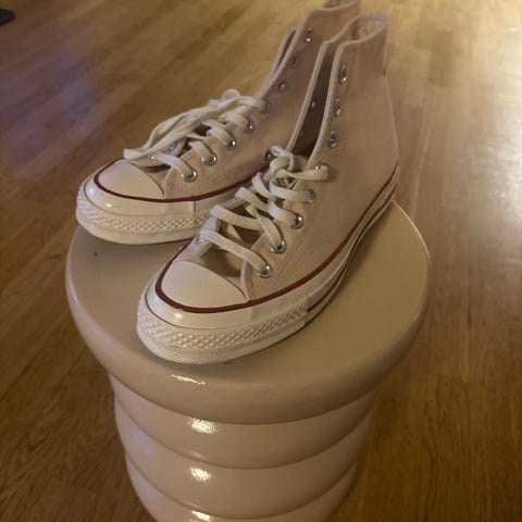 Converse Chuck Taylor All Star høye sneakers i størrelse 38. Modellen er i beige canvas med klassisk gummisåle og snøring foran. Skoene har den karakteristiske Converse-logoen på siden og hælen. Egnet som fritidssko til hverdagsbruk.