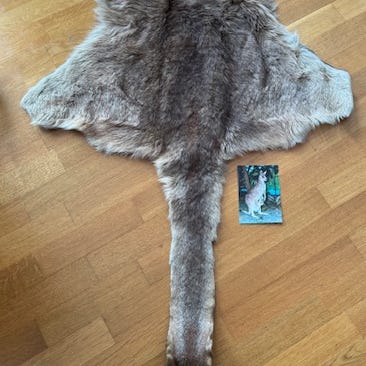 Naturlig pels på oversiden og garvet skinn på undersiden. Egner seg som dekor, sitteunderlag eller til håndverksprosjekter. Formen følger skinnet til kenguruen med halen i full lengde. Noen små hull i kantene, etter at det har vært stiftet på en vegg. Dette synes ikke på pels siden