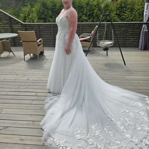 Kjolen er kjøpt ny hos White by Green og det medfølger kjolepose derfra. Ny pris er 23000,- + skredderjobben på 3000,-. Det er påsydd dansehempe.