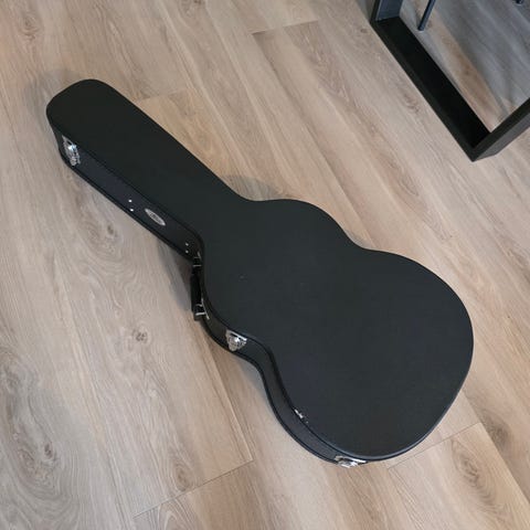 Gitaretui hardcase for gitar. Etuiet har svart utside og mykt blått fôr på innsiden. Innvendig er det et eget rom med lokk for oppbevaring av tilbehør som plekter, stemmeapparat eller kabler. Etuiet har bærehåndtak og metallbeslag for lukking. Egnet for trygg oppbevaring og transport av gitar.