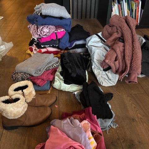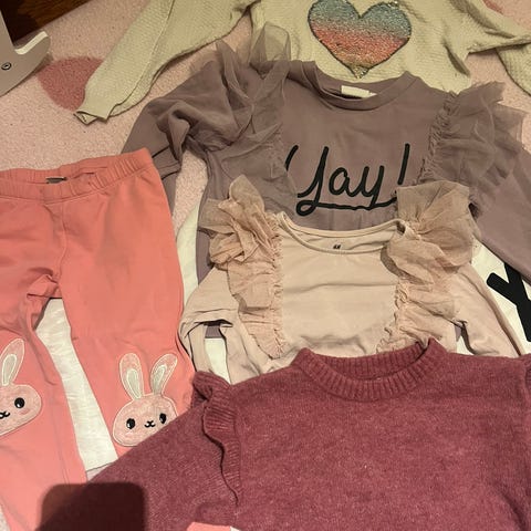 Fire bukser, en vest, åtte gensere og en strikket genser.