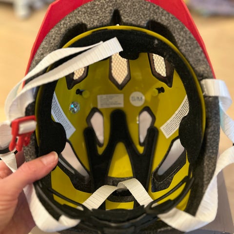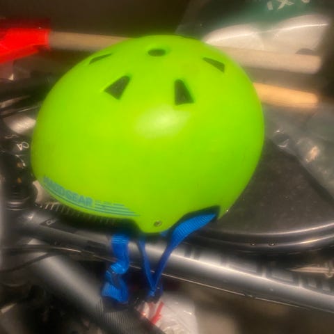 Sykkelhjelm for barn i blå farge med flere ventilasjonsåpninger. Innsiden har rød polstring og turkise justerbare stropper med klips. Hjelmen har hard ytterskall og støtdempende innerkjerne i skum. Egnet til sykling og annen bruk der hodebeskyttelse er nødvendig for barn.