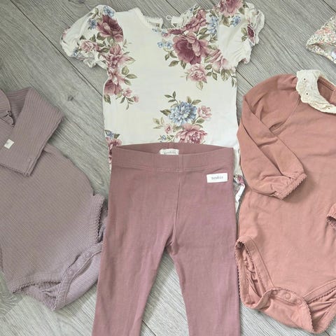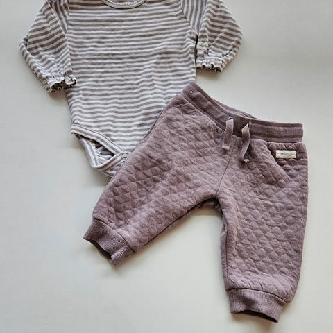Sett med flere plagg i myke, ribbestrikkede materialer.