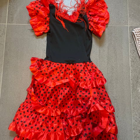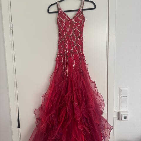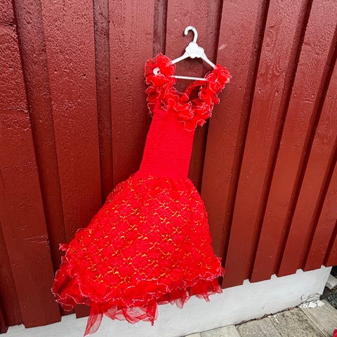 Kjole for dame i rød farge med voluminøse volanger og dekorative blomsterdetaljer foran. Overdelen er tettsittende, mens skjørtet har flere lag med rysjer som gir et dramatisk uttrykk. Passer til anledninger der en mer iøynefallende kjole er ønsket, som fest eller sceneopptreden.