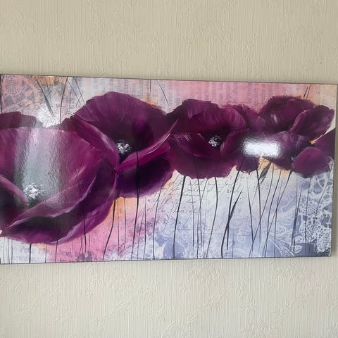 Maleri på lerret med motiv av tre stiliserte blomster i lilla og rosa toner mot en lys, abstrakt bakgrunn. Bildet har en kvadratisk form og er utført i en grov, teksturert maleteknikk. Passer som veggdekor i stue, soverom eller gang