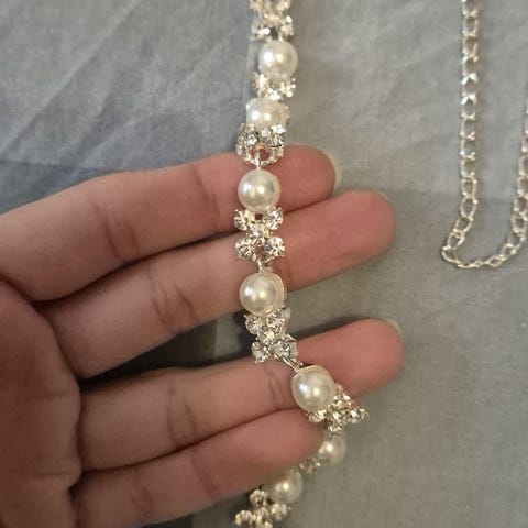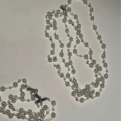 Smykkesett for dame bestående av kjede,øredobber og armbånd med hvite perlerog strass. Passer som tilbehør til både hverdag og mer formelle anledninger. Er ikke sølv.