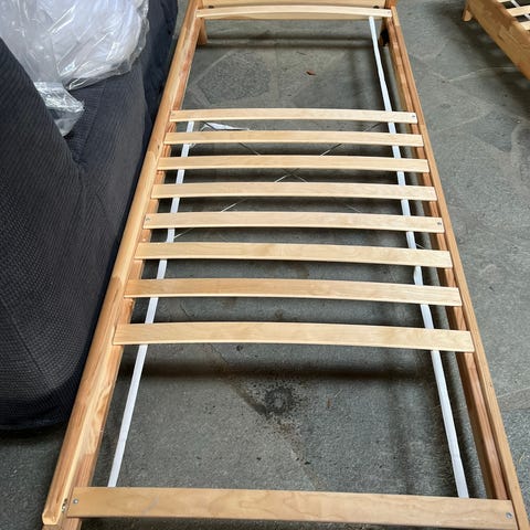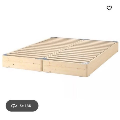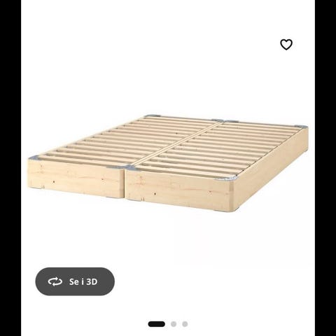 IKEA seng med ribbebunn i tre og metallramme. Sengen har ribbebunn av trelameller festet i en metallkonstruksjon. Egner seg som enkeltseng, gjesteseng eller til soverom der det er behov for en ramme med ribbebunn. Flere løse metallstenger og deler følger med, som ser ut til å høre til sengens understell eller ben.