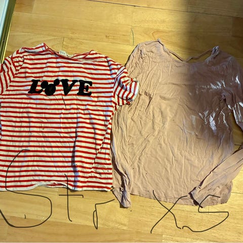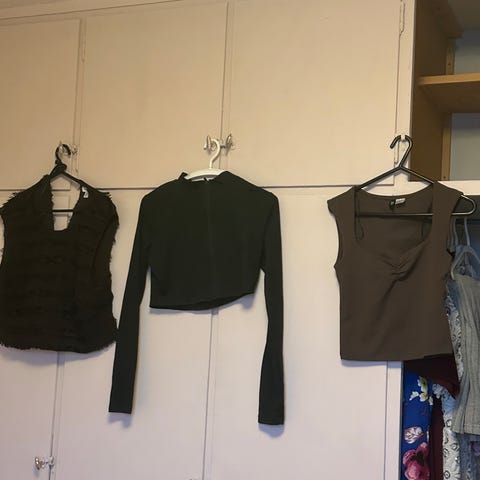 H&M topper i størrelse XS/34 for dame. Passer også en S. 2 av toppene er i polyester. Den uten erm er I viscose. Passer som enkel overdel til hverdagsbruk eller til mer pyntede anledninger, og kan kombineres med både bukser og skjørt.