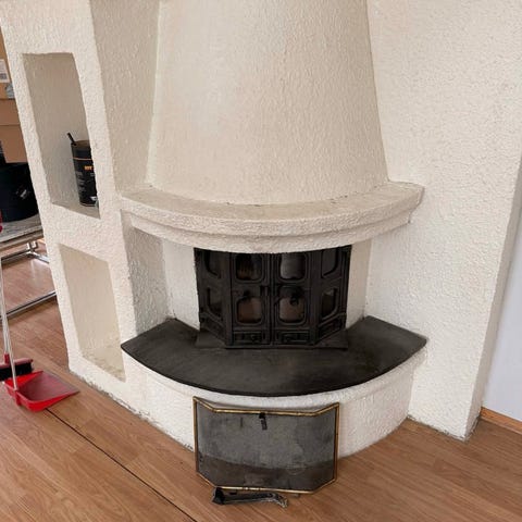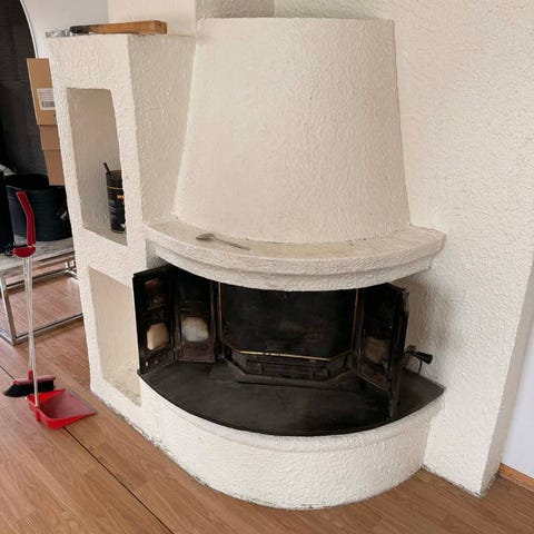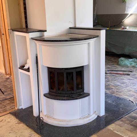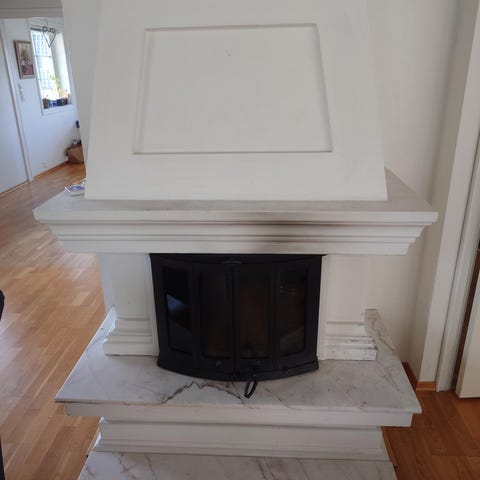 Peisinnsats i hjørnepeisutførelse med glassdører i front. Overdelen har mørk marmorplate og hvitmalt omramming. Under brennkammeret er det en åpen nisje som kan brukes til oppbevaring, for eksempel ved. Peisen er beregnet for montering i hjørne og gir innsyn til flammene gjennom glassdørene. Passer fint for kjøkken/spisestue. Peisen er veldig lite brukt. Er demontert av selger.