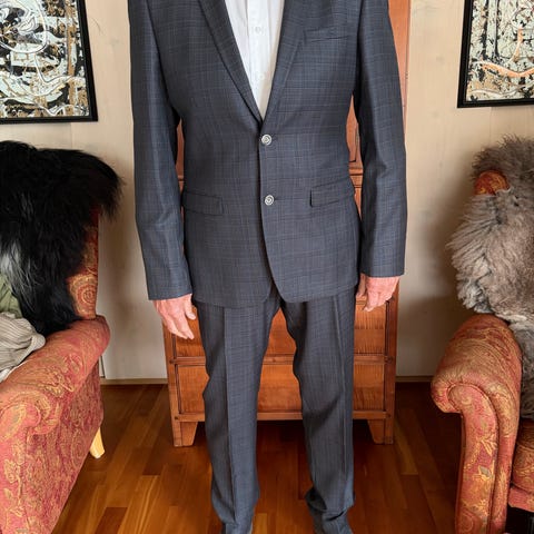 Moods of Norway dress for herre i størrelse L. Dressen er grå og laget i ull. Den har klassisk jakkeslag, brystlomme og klaffelommer foran. Innsiden har mønstret fôr med flere merkelapper og detaljer.