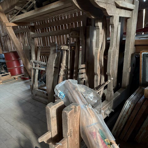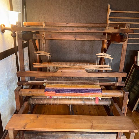 Den ene vevramnen består av en rektangulær ramme med metallstenger og snorer for oppspenning av renning.