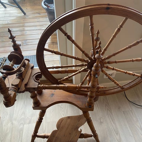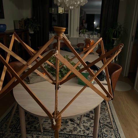 Garnvinden er laget i tre og kan foldes ut og inn. Den brukes til å holde hesper på plass ved oppnøsting til nøster.