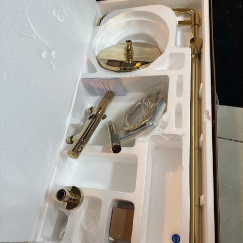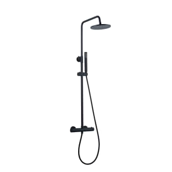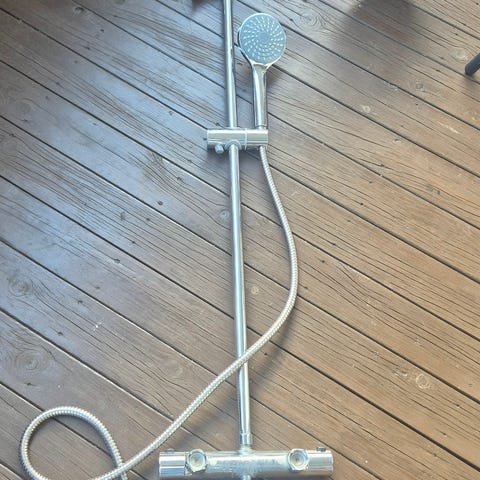 Dusjsett med takdusj og hånddusj i kromfarget utførelse. Settet består av rund takdusj, rektangulær hånddusj, dusjstang, fleksible slanger og tilkoblingsdeler. Passer til montering i dusj eller badekar der det er standard veggtilkobling for dusj. Materialet fremstår som metall med kromfinish og plastdetaljer i dusjhodene. Egnet for vanlig bruk på bad i bolig.