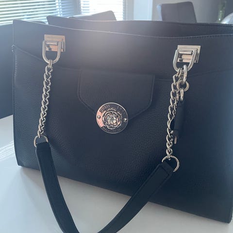 Guess skulderveske i kunstlær for dame. Vesken er hovedsakelig svart med en dekorativ midtstripe i slangeskinnmønstret materiale og liten metall gull logo i front. Den har skulderrem med kombinasjon av lenke og skinnrem. Innvendig er vesken fôret med mønstret stoff med guess-logo og har flere lommer, blant annet glidelåslomme og åpne lommer for organisering av mindre eiendeler. Egner seg som hverdagsveske eller til enklere penere antrekk.