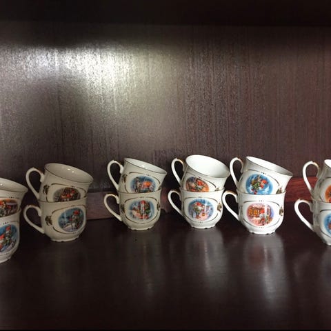 Inneholder bla 12 middagstallerkener, 12 grøttallerkner, 12 frokosttallerkner, kake og kaffeservise til 12 personer, sausenebb, serveringsfat, potet og grønnsaksboller ++