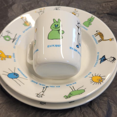 Barneservise tallerken og kopp med illustrasjon fra bordbønn «å, du som metter».