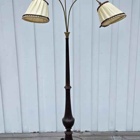Flott retro gulvlampe fra 1960–70-tallet med to justerbare lesehoder.