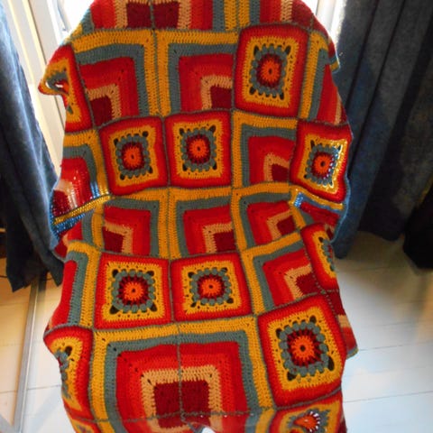 Håndlaget teppe med bølgemønster i røde og flerfargede striper. Teppe i rektangulær form, str 156cm x 110 cm. 80% ull. Alt garn er ny. Passer fint på sofa, i bilen, på hytta og på enkelt seng.