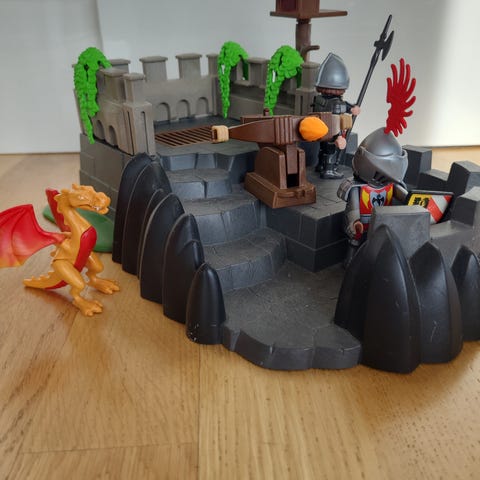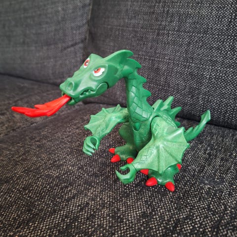 Playmobil drage i grønn plast med røde detaljer. Figuren har bevegelige lemmer og vinger, samt rød flamme i munnen. Egnet som tilbehør til Playmobil-riddersett eller annen fantasilek. Passer for barn som liker drager og eventyrlek.