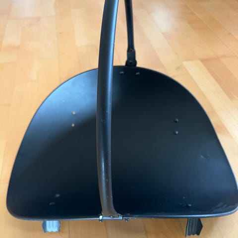 Vedkurv i svart farge med runde nagler rundt kanten og ringformede hanker på sidene. Bøtten har sylinderform og flat bunn. Egner seg for oppbevaring eller dekor innendørs eller utendørs, for eksempel til ved, planter eller annet utstyr.