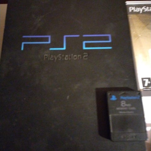 Sony PlayStation 2 spillkonsoll i svart. Dette er den originale, store PS2-modellen med innebygd strømtilkobling på baksiden. Konsollen har frontlaster for DVD-spill, minnekortplasser og kontrollerporter på fremsiden. På baksiden finnes strømknapp, strømtilkobling, AV-utgang og nettverks-/tilkoblingsporter (avhengig av modell). Egnet for avspilling av PlayStation 2-spill på plate samt DVD-filmer, for bruk med kompatible kontrollere, minnekort og tilkoblingskabler (ikke vist om dette følger med).