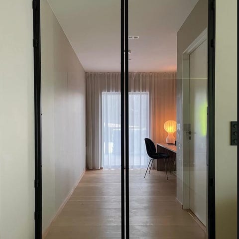 Innerdør med glassfelt og svart metallramme. Mål på døren er ca. 83 cm bredde og 201,5 cm høyde. Passer som innvendig dør mellom rom der man ønsker lysgjennomgang og et moderne uttrykk.