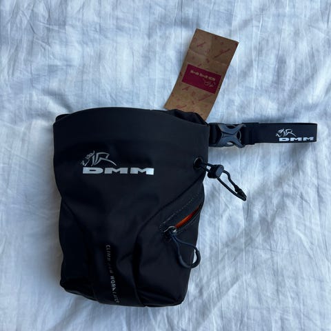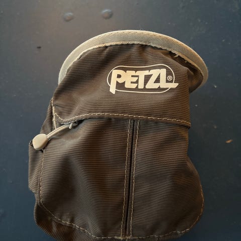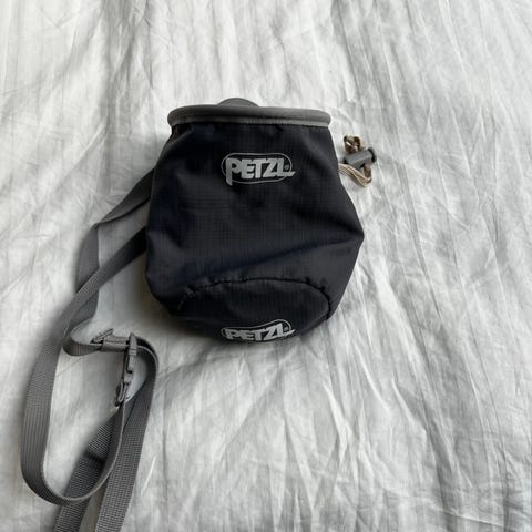 Petzl Sakab kalkpose i grå og oransje farge. Modellen er en stor, frittstående kalkpose utformet som en liten bag, med bærehåndtak og stor åpning på toppen. Frontlommen med glidelås gir plass til småutstyr som børste, tape eller kalk. Kalkposen er beregnet for klatring og buldring, og kan brukes både inne og ute. Materialet er tekstil med forsterket bunn for stabilitet på bakken.