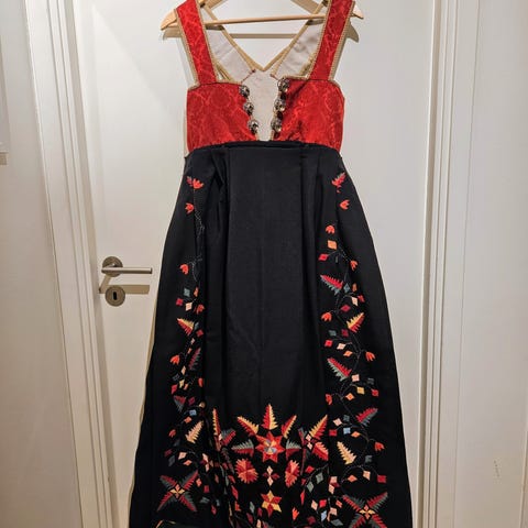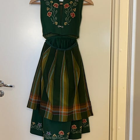 Gamal Vest-Telemarksbunad tilsals. Svært fin brodering. Sydd av ei som var syerske. Har høyrt til i familien, og vi antek den er omlag 100 år. Ingen møllskader. Men det har dessverre kome nokre flekkar på stakken framme (sjå bildet). Meiner den passar best for jente i konfirmasjonsalder. Sjå vedlagte teikning med påførte mål.