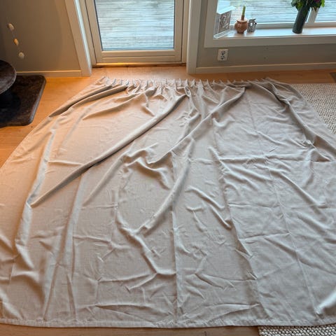 Disse har krympet i vask og er mulig noe kortere på lengden men vil rette seg ut igjen en del etter stryking/steaming. Fôret har ikke krympet og er derfor litt lenger enn foran nå som den ikke er steamet. Mulig denne må legges opp noe. Den ene gardinen har en stripe på baksiden som vist på bilde.