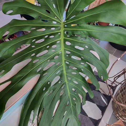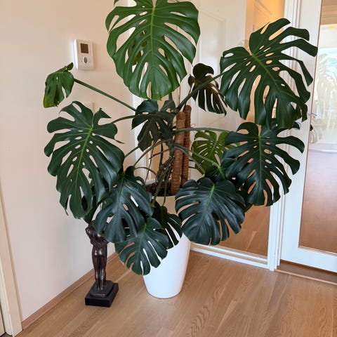 Monstera deliciosa potteplante i stor størrelse. Planten står i potte og er støttet opp med klatrestøtte. Egner seg som inneplante i rom med jevn temperatur og indirekte lys. Krever jevn vanning og trives i fuktig, men veldrenert jord.