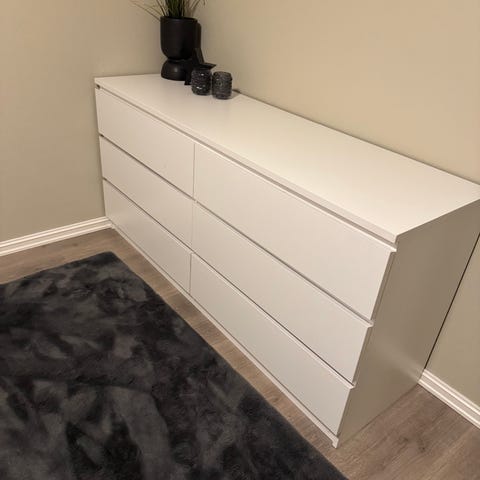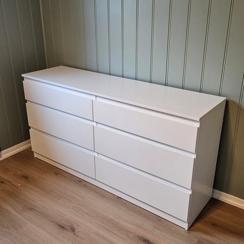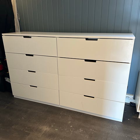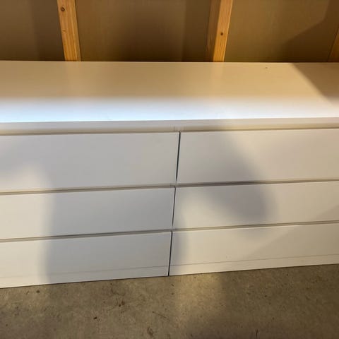 Kommoden er pent brukt, men har en liten skade nederst på siden (se bilde). Den ene nederste skuffen er litt løs.