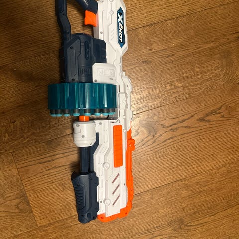 Lekegevær i plast. Lekegeværet er egnet til bruk med Nerf-skumprosjektiler (piler eller skudd) og passer til lek både inne og ute. Designet for barn som liker action- og rollelek med Nerf-utstyr. Mye god lek igjen.