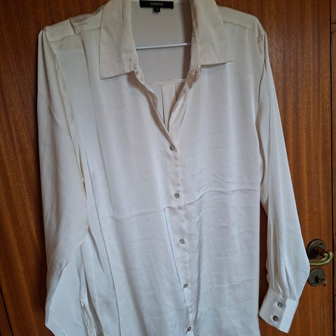 Mango Basics skjorte for dame i størrelse L. Skjorten er hvit og laget i polyester. Den har klassisk krage, lange ermer med mansjetter og knappelukking foran. Rett passform og lett, glatt materiale som egner seg godt til både hverdags- og kontorbruk.