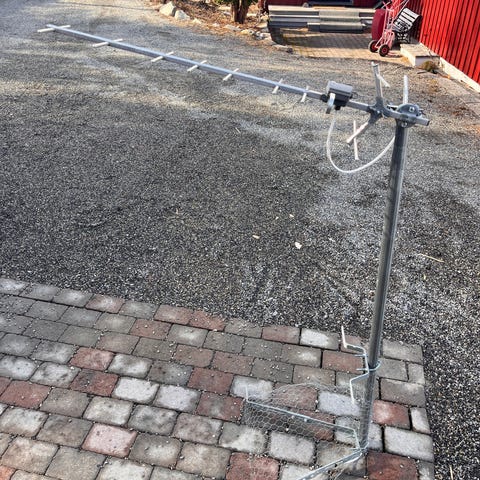 2 stk paraboler, én stor fra Grundig med LNB-hode for satellitt-TV (?), én mindre der jeg ikke ser merkenavn, samt en bakkenett-antenne.