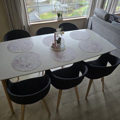 Selger 6 stk spise stue stoler hvis m pvc hvit sitte pute, pent brukt, ene stolen har bruks merke selges kun samlet.
