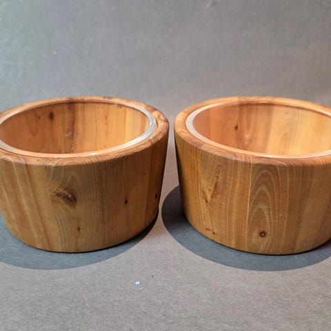 Fin beholder i tre for å pynte litt ekstra til et pent pyntet bord. Kan også brukes til lyng eller sommerblomster for eksempel. Sender gjerne.
