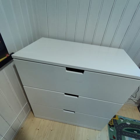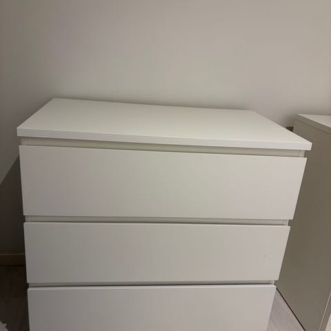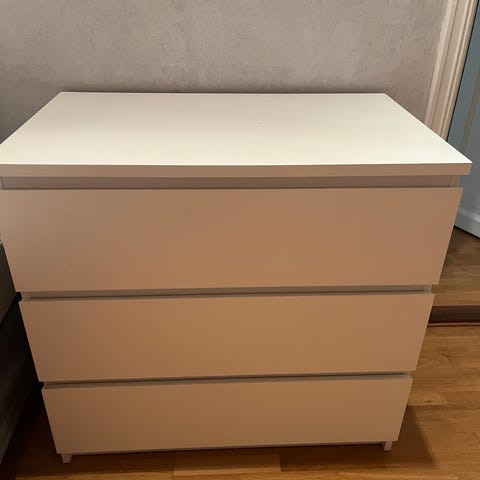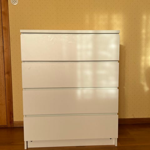 Selger en brukt MALM kommode, 4 skuffer og hvit. Den er pent brukt men har en liten slitasje mellom to av skuffene.
