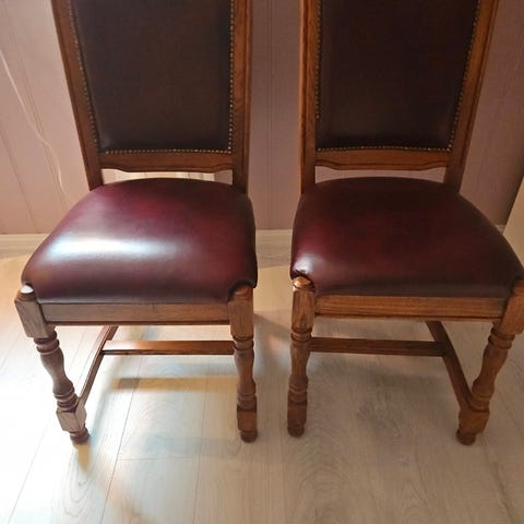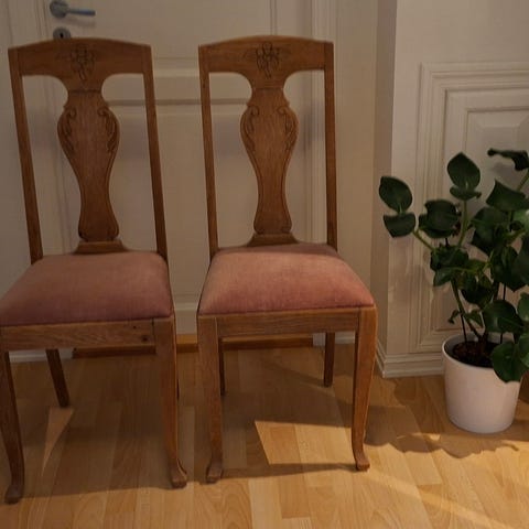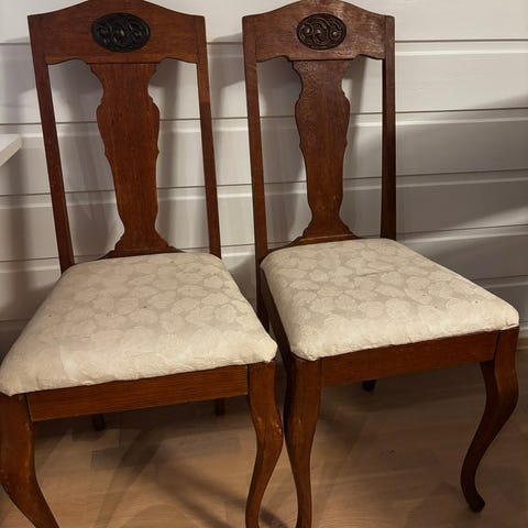 Four elegant, sturdy chairs in dark wood with upholstered seats. Classic design with beautiful carved details on the backrests. Gently used and in good condition. Price: NOK 100 per chair.