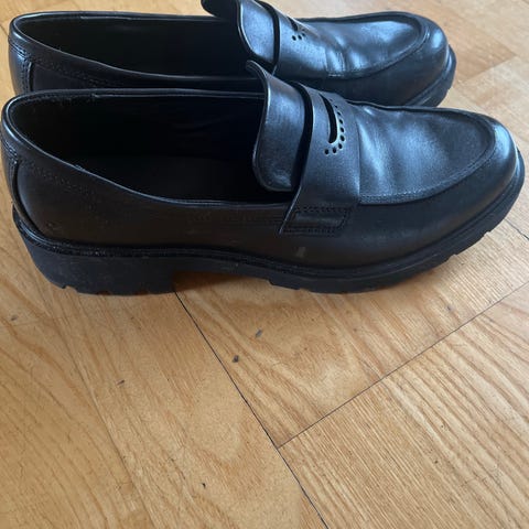 Kjempefine Ecco loafers i størrelse 39. Skoene er laget i svart skinn med frynser og kraftig gummisåle med godt mønster. Klassisk slip-on modell uten lisser.