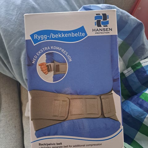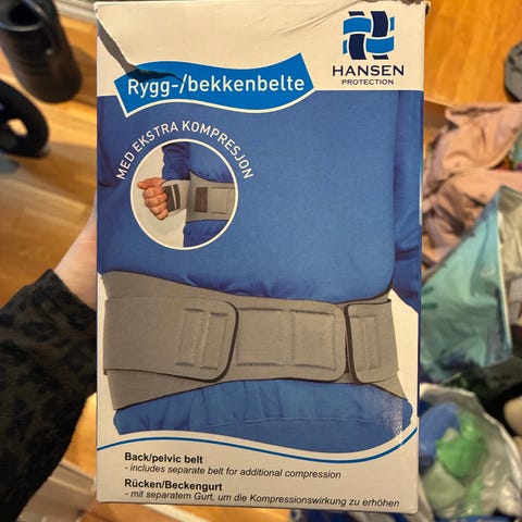 Rygg/bekkenbelte fra Hansen Protection i størrelse M, som tilsvarer 90-110cm. Pent brukt. Kjøpt for 600kr på apoteket.