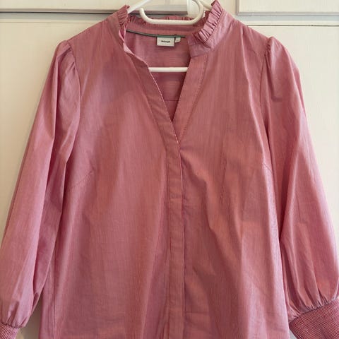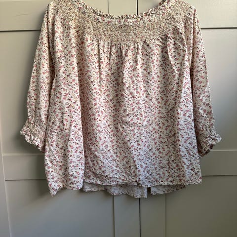 Nümph bluse i str 38 til dame. Blusen har små blomstermønster. Modellen har halvlange ermer med bred, rynket mansjett og lett puff over skuldrene. Halsen er høy med liten volangkant, og blusen lukkes foran med knapper (ikke synlige). Egner seg til både hverdagsbruk eller mer pyntede anledninger, og kan kombineres med både bukser og skjørt.