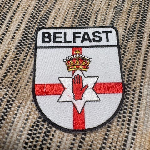 Dropkick Murphys Irish Stout broderingsmerke. Motiv med tekst «Dropkick Murphys Irish Stout» i grønt, rødt, svart og beige. Passer til å sy eller stryke på klær, vesker eller andre tekstiler, avhengig av bakside og festemetode.