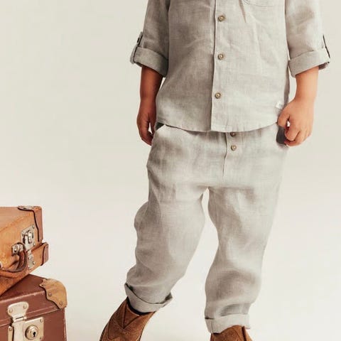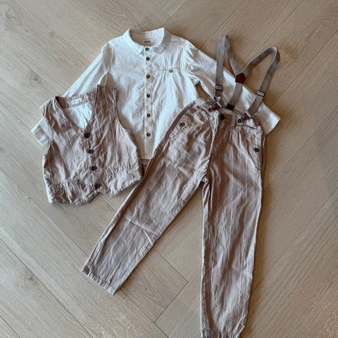 Sett består av langermet skjorte og bukse i beige lin. Skjorten har krage, knappestolpe foran, brystlomme og ermer som kan brettes opp og festes med knapp. Buksen har strikk i livet og rette ben. Materiale i lin gir et lett og luftig sett som passer til både hverdag og mer pyntede anledninger.