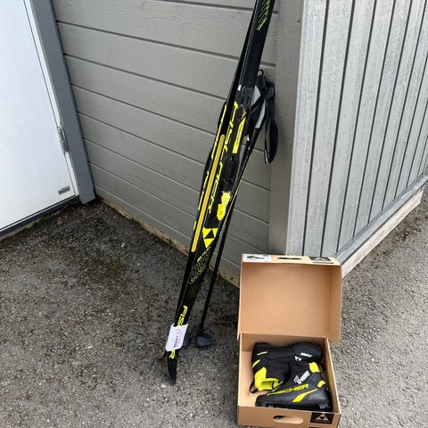 Pakke med flere par langrennsko og et par langrennski. Langrennskene er i hovedsak svarte og grå med polstret innside og snøring/stramming foran. De er beregnet for bruk sammen med langrennsbindinger. Skiene er klassiske langrennski i standard bredde, egnet til turbruk. Passer for langrenn på preparerte løyper. Størrelser og eksakte modeller fremgår ikke av bildene og bør avklares ved interesse.